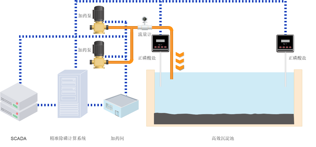 根据进水流量、进、出水正磷酸盐、浊度等仪表数据,预测除磷药剂投加量,并将预测结果与除磷池出水端仪表示数(PO4)对比以实现模型自动反馈修正。