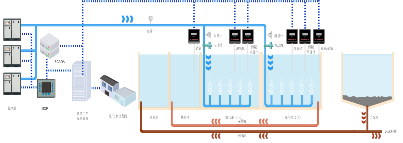 通过每日数据更新,系统自动生成24小时的氨氮和硝态氮负荷预测。这些预测结果给到系统的模型算法中,为每个反应池计算出最优的溶解氧、污泥内回流、污泥外回流和剩余污泥量控制指标值。为了确保预测的准确性,系统设计了异常数据过滤机制,自动剔除氨氮传感器可能出现的错误数据。此外,系统还引入软传感技术,通过历史运行数据替代异常数据点,并结合生物池在线出水氨氮和硝态氮浓度数据进行校准,极大地提高了预测精度,在提高氨氮总氮及COD去除效率的基础上降低运行费。